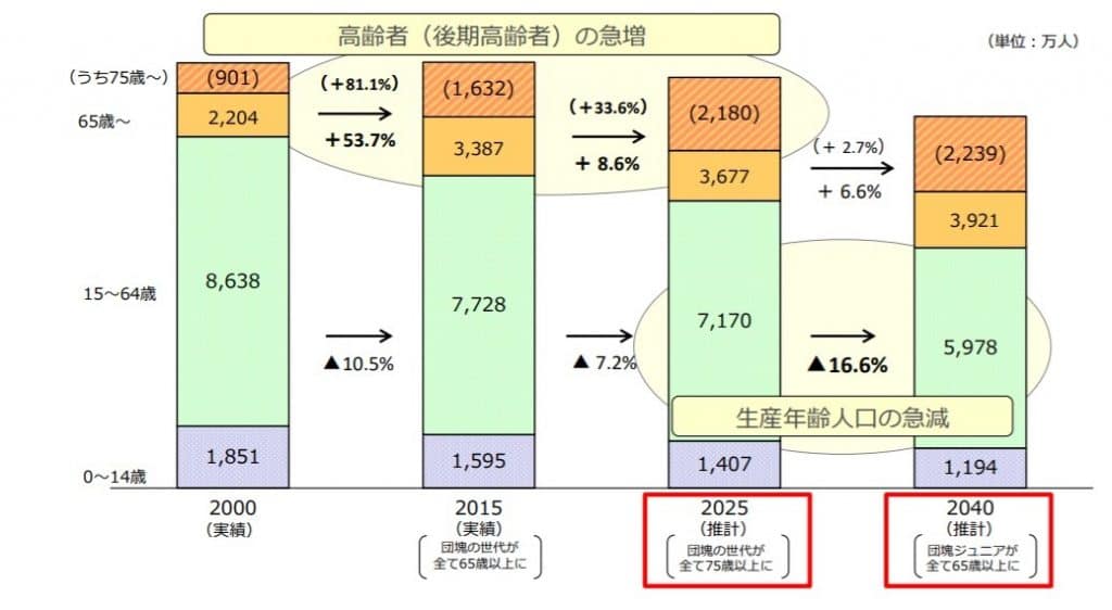 国内の人口動態は、いわゆる団塊の世代が全員75歳以上となる2025年に向けて高齢者の人口が急速に増加した後、緩やかになってきます。一方で、既に減少に転じている生産年齢人口は、2025年以降さらに減少が加速していきます。